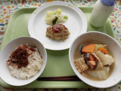 鶏肉とごぼうを使った料理に「炊き込みごはん」や「煮物」があります。とても相性が良い和食の献立となります。今日はハンバーグにしました。