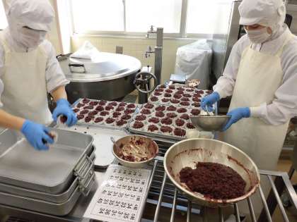 写真は「あんこもち」を作っているところです。全部で1070個作りました。