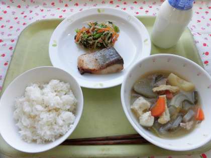今日の主食はぶりの照り焼きです。ぶりは大きくなるにつれ、呼び名が変わる出世魚です。関西、関東などの地域でも変わります。モジャコ→ハマチ(イナダ)→ワラサ→ブリなどです。刺身、照り焼き、煮付けなどで食べられています。給食では照り焼きでいただきます。