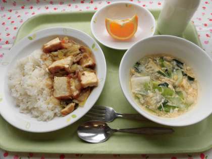 豆腐を薄く切って揚げると油揚げですが、一丁まるごと揚げると生揚げとなります。今日は生揚げと豚肉、野菜と炒めてとろみをつけてごはんといただきました。中国の家庭料理と言われています。
