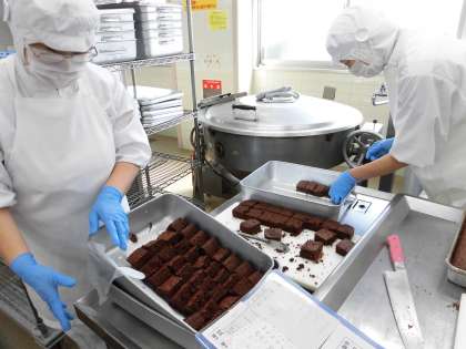 写真はでき上がりのブラウニーをクラス配分しているところです。