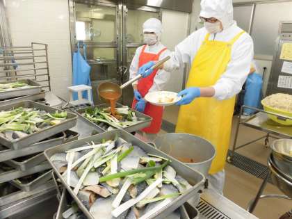 鯖は、味噌、酒、砂糖などの調味料と、生姜、ネギを入れ、スチームコンべクションで煮込んで作りました。
