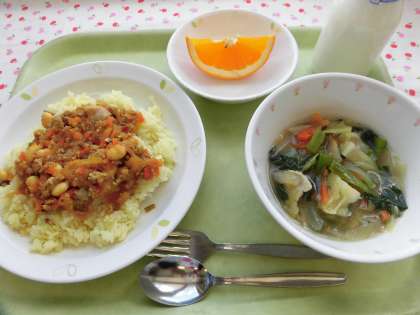 ドライカレーはインドの作り方に見習っています。本場インドでは、豚肉は使われていませんが、給食では豚ひき肉を使いました。レーズンで辛みを抑えてまろやかさをいただきます。大豆以外に、ひよこ豆は良く食べられているようです。