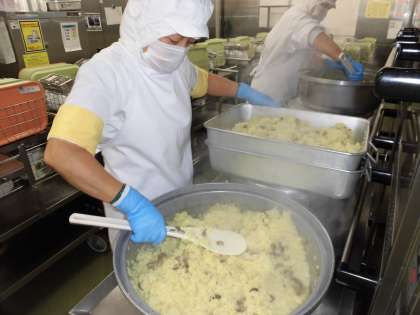 写真はマッシュルームの入った、カレー風味のごはんをクラスに配缶しているところです。