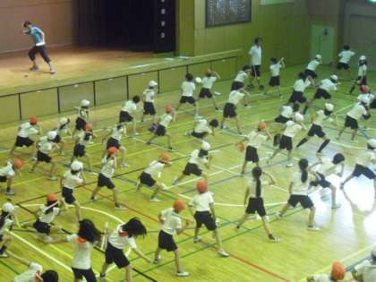 4年の表現は「エイサー〜それが南の宝〜」です。今はまだ練習中ですので、棒は新聞紙を丸めたもの、太鼓は家から持ってきた箱です。ゆったりとした音楽にのって動くには難しいことです。大きくゆったりと、メリハリをつけて。4年生は頑張っています。当日をお楽しみに!