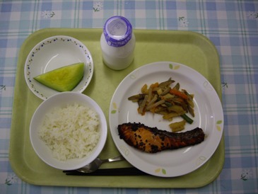 今日のメニューは「ごはん、牛乳、サケの南部焼き、じゃがいものきんぴら煮、くだもの(メロン)」です。運動会の練習で汗をいっぱいかいて、冷たい牛乳やメロンはごちそうです。今日のメロンは熊本県産のアンデスメロンです。