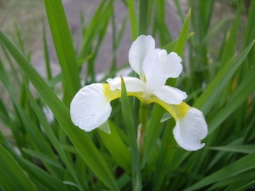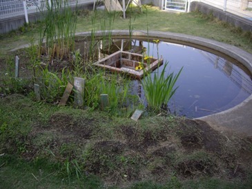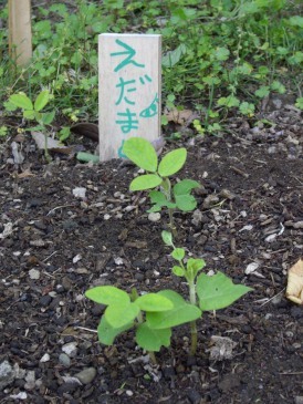 午後4時過ぎのビオトープの様子です。枝豆が小さな芽を出していました。水辺には白いきれいな花が咲いていました。