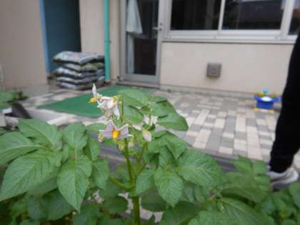 写真は、1年生教室の前で栽培している植物です。4月の終わりに植えて、ついに花が咲きました。授業で使う予定の植物ですが、何だと思いますか。答えが分かった人は、明日、先生に伝えてください。