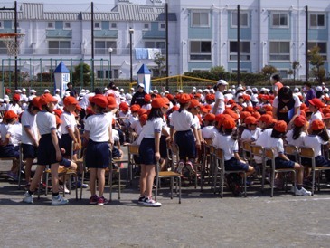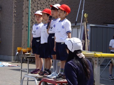 5月25日水曜日、全校練習で椅子だしをしました。椅子を並べた後は、開会式と閉会式の練習です。開会式では、1年生の児童代表の言葉の練習もしました。よい天気の下、上手にできました。