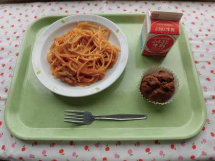給食で使用するスパゲッティの麺は、市販の麺の半分ほどの長さのため、配膳しやすく、また食べやすいようになっています。