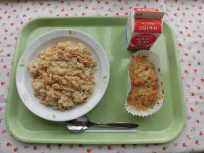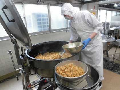 高野豆腐のそぼろごはんは、回転釜で具を炒めてから、炊いたごはんと混ぜ合わせています。どのクラスもよく食べていました。