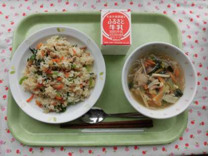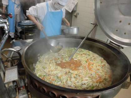 春雨スープは、春雨の他に鶏肉や野菜、きのこが入ってボリュームたっぷりのスープです。2枚目の写真は、給食室の回転釜で春雨スープの味付けをしているところです。春雨スープおいしかった!という感想を何人もの児童からもらいました。