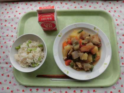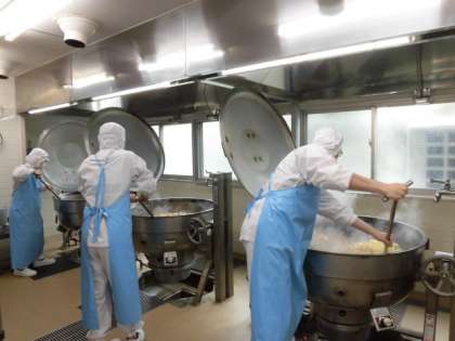 筑前煮は、もともとは九州地方の郷土料理ですが、今では全国的に有名な料理ですね。にんじんやごぼうなどの野菜と、こんにゃく、鶏肉、さつま揚げが入って食べ応えのある量でした。約1000人分を作るため、給食室では大きな回転釜を3台使って作りました。