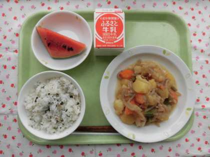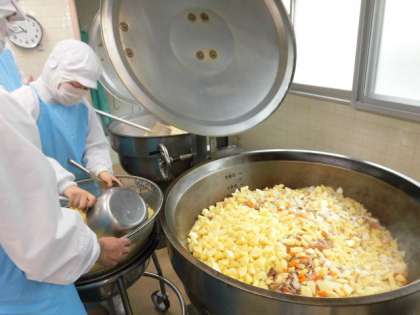 ボリュームたっぷりの肉じゃがは、給食室の回転釜を3つ使って作ります。時間をかけて煮込み、しっかりと具材に味をしみこませました。