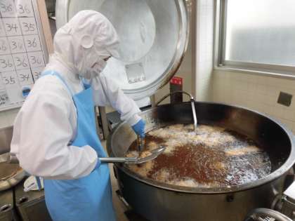 いかのかりん揚げは、いかをしょうゆやしょうがに漬け込んで揚げました。いかを切って揚げた姿がかりんとうに似ていることから、かりん揚げという名前がついたそうです。