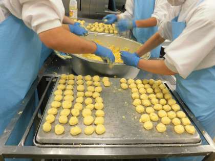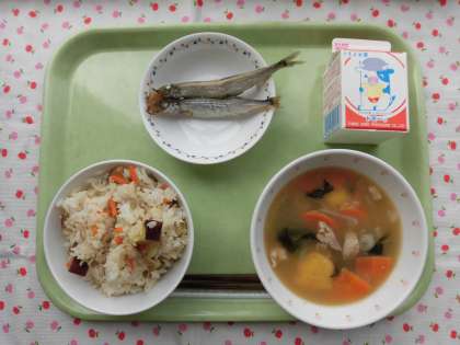 給食ではかぼちゃ入りの白玉団子でお月見団子汁を作りました。かぼちゃを蒸してつぶし白玉粉と混ぜ、一つ一つ丁寧に丸めました。