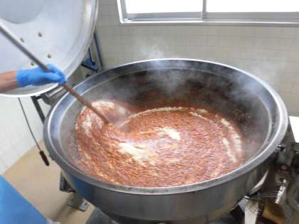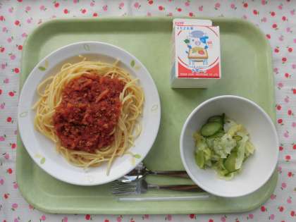ミートソースは、給食室でじっくりと煮込んでいるのでトマトや肉のうま味がしっかりと出ています。最後に粉チーズを加えるものポイントです。