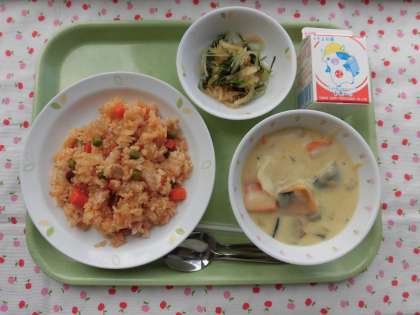 「今日はチキンライスもパンプキンシチューも大盛りにする!」と張り切っている児童がいました。