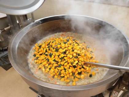 今日はハロウィンにちなんでパンプキンシチューを出しました。給食室でホワイトルウから手作りしています。