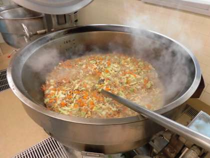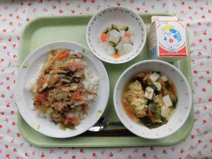焼き肉丼は、にんじん、たまねぎ、キャベツ、ピーマンなど野菜がたくさん入っています。また、一味唐辛子やごま油を使っていて食欲をそそる味付けです。各クラスからも、おいしかったという感想が多くありました。
