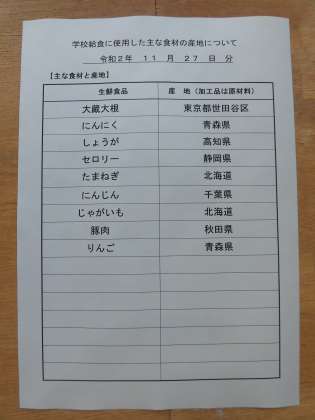 今日の給食では、世田谷区産の大蔵大根を使用しています。サラダには大蔵大根の葉も入れました。地域の農産物を地域で消費することを「地産地消」といい、安くて新鮮なものが食べられるなど様々なメリットがあります。