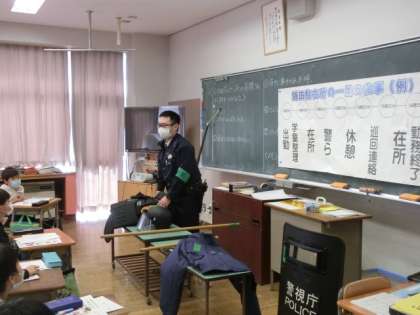 3年生の社会科「事故から地域の安全を守る」の学習で、地域の駐在所の警察官の方から警察の仕事について教えていただきました。1日の仕事の流れや仕事道具を紹介してくださったり、子どもたちからの質問にも答えていただきました。子どもたちはノートいっぱいにメモをとりながら聞いていました。