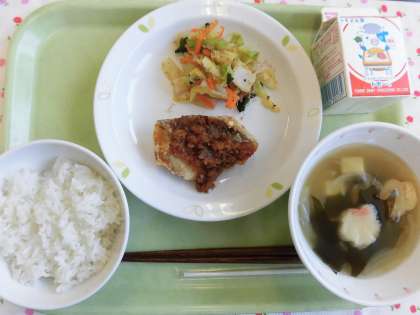 6年生が2年生だったころです。そのときの魚は鯵(アジ)でしたが、今日は鯛(タイ)を使っています。漁業組合からの提供を受け、献立に取り入れることができました。鯛は「めでたい」にも通じ、縁起物の魚としても有名です。