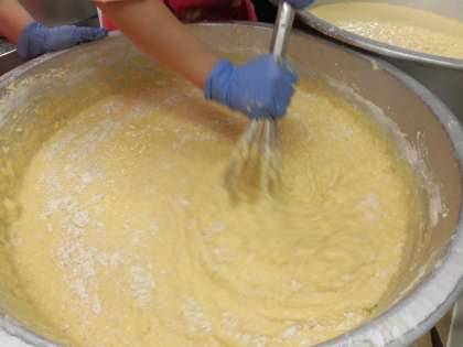 今日のデザートはパインケーキです。パイナップルはアメリカ原産の植物です。松ぼっくりを意味する「パイン」とくだものを意味する「アップル」から、パインアップルと呼ばれるようになったといわれています。ちなみに沖縄では8月1日をパインの日としているそうです。2枚目の写真はパインケーキを混ぜているところです。