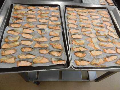 今日の主菜は、鮭の照り焼きです。鮭の身はオレンジ色をしていますが、白身魚の仲間です。「サーモンピンク」ともいわれる、身の色は鮭の食べるエビやオキアミなどの色が移るのだそうです。給食室では、鮭を鉄板に並べてオーブンで焼きます。