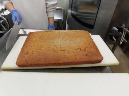 がんづきは東北地方の郷土料理で、蒸しパンに似たものです。小麦粉、黒砂糖、赤みそ、黒ごまなどを使っています。普段のお昼ご飯やおやつに食べたり、冠婚葬祭の引き出物として贈ったりするそうです。今日はオーブンで焼きました。写真は、焼き上がったがんづきを切り分けているところです。