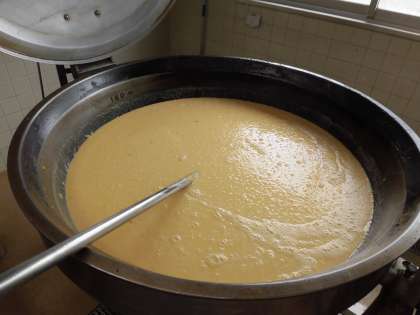今日のコーンポタージュには、コーンのほかにも、玉ねぎ、にんじん、じゃがいも、米などが入っています。食材がやわらかくなるまで釜で煮込んだ後、さらにミキサーにかけてなめらかにしています。