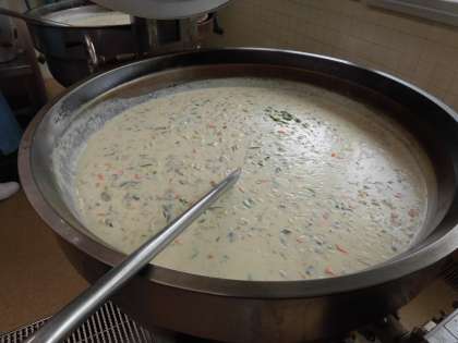 写真は、給食室の釜でクリームシチューを煮込んでいるところです。