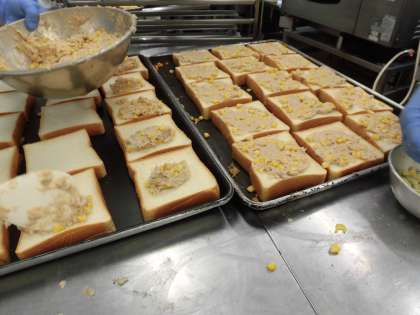 コーン入りツナトーストは、炒めたコーンとツナに牛乳と小麦粉を加えてホワイトソースを作り、食パンにぬっています。