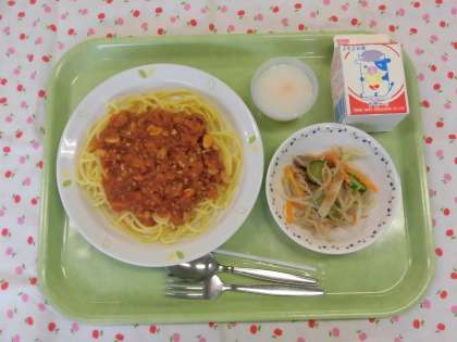 今日の主食は、スパゲッティビーンズミートソースです。ミートソースに大豆が入っています。大豆は、良質なたんぱく質を豊富に含むことから、「畑の肉」といわれています。子供たちに積極的に食べてほしい食べ物の1つです。食べやすいように細かく刻んでソースの中に入れました。