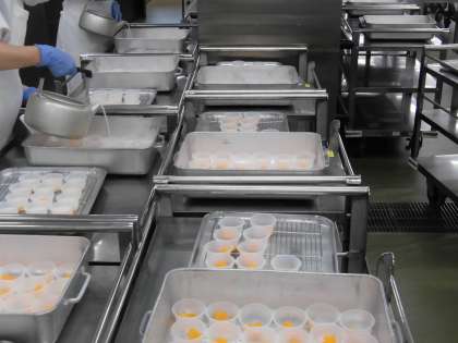 ホワイトゼリーは、乳酸菌飲料(カルピス)を使っています。中にはみかんが入っています。ゼリーを作る作業は、写真のように給食室で行っています。