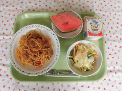 今日の主食は、スパゲッティナポリタンです。スパゲッティナポリタンは、玉ねぎやピーマンなどの具材を炒めて麺と混ぜ合わせ、ケチャップで味付けをします。この作り方は横浜が発祥といわれていて、実はイタリアのナポリとは関係がないそうです。