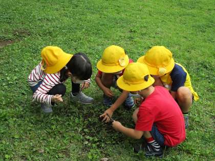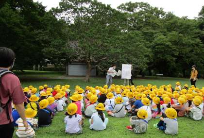広い芝生で、ペアになって色々なものを見付ける「ネイチャーゲーム」に挑戦したり、思い切り走ったりして、初夏の自然を楽しみました。