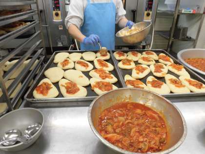 ナンピザは、ベーコン、玉ねぎ、ピーマンなどの具が入ったトマトソースをナンにのせ、オーブンで焼いています。表面はカリッと、中はしっとりとした食感です。