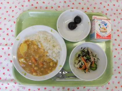 今日から2学期の給食が始まりました。今日は、豆入りチキンカレーです。大豆が入っています。大豆は、植物性の食品の中では特にたんぱく質を多く含んでいる食材で「畑の肉」とも呼ばれます。
