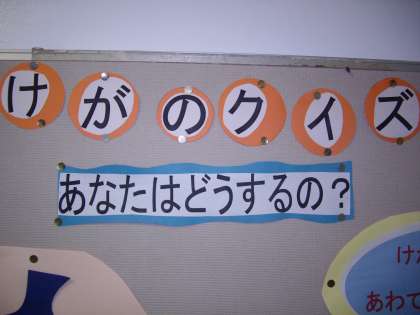 9月の保健室前の掲示を紹介します。今月は、けがをした時どうすればいいのかをクイズ形式で分かりやすく説明しています。ご来校の際、ご覧ください。