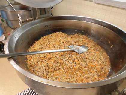 今日の主食はプルコギ丼です。プルコギは韓国料理の一つで、タレに漬け込んだ肉を野菜と炒めたものです。甘辛い味付けなので、辛いものが苦手な人でも食べやすい料理です。今日は、タレにうまみを出すために果物のなしを加えています。