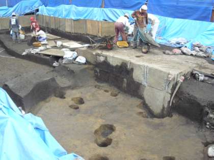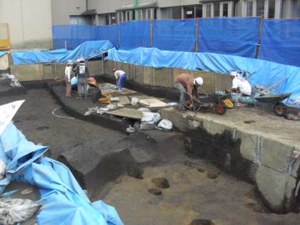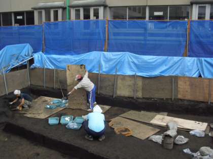 校舎増築に伴う切り回し工事に引き続き、校庭で埋蔵文化財遺跡調査が行われています。6000年前の住居跡が5件と縄文時代の土器のかけらが発掘されました。来週からは埋め戻し作業に入ります。保護者の皆様で関心のある方は、校庭のフェンス越しか、校舎のオープン側の窓から様子をご覧になれます。