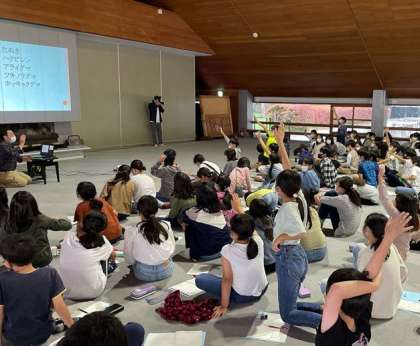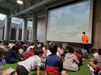 雨のため、屋内での活動になりました。メモをとりながら真剣に話を聞いています。