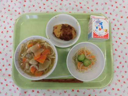 児童からは、「おっきりこみ風うどんの汁が麺にしみていておいしかったです」「こんにゃくサラダの食感がぷるぷるでおいしかったです」という感想がありました。