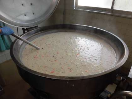 今日は、旬のさつまいもが入ったさつまいものシチューです。さつまいもや鶏肉のほかに、ゆでてペースト状にした白いんげん豆が入っています。