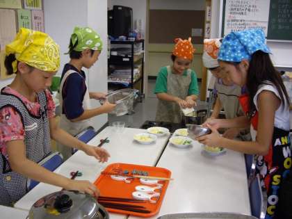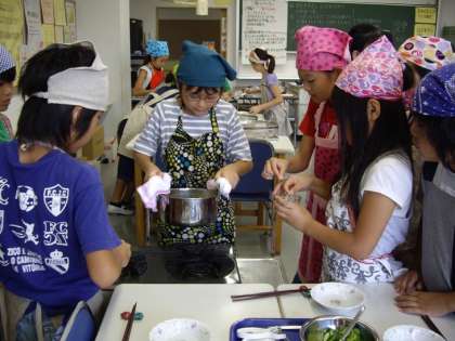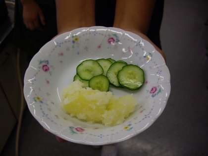 家庭科の授業で、5年生が調理実習をしました。メニューは、粉ふきいもときゅうりの一塩です。じゃがいもの皮をむいて、芽を取って、一口大に切って柔らかく茹でます。作業は手分けをして協力して進めます。きゅうりは薄切りにして味付けをします。ちょうどよい塩味のおいしい料理が出来上がりました。盛り付けもきれいです。