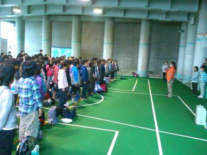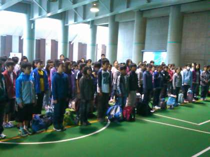 外は雨降りです。開室式を屋根つき広場でしました。これから食事です。