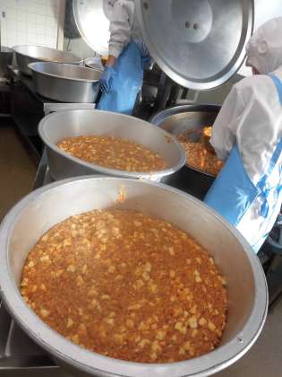 今日の主菜は、豆腐のミートグラタンです。全校分で、約75kgの豆腐を使っています。