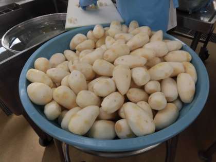 今日の主食は里いもごはんです。里いもは、中心に親芋ができて、その周りに小さな子芋、孫芋ができるため、子孫繁栄の縁起物として正月料理などに使われます。一般にスーパーなどで売られている里いもは「土垂(どだれ)」という品種で、関東地方で多く栽培されています。そのほかに「八ツ頭(やつがしら)」や「海老いも(えびいも)」などの品種があります。