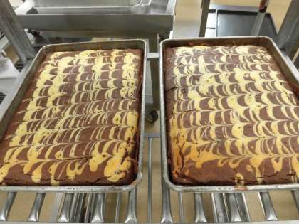 今日は、バレンタインデーにちなんで米粉ココアマーブルケーキを出しました。ココア生地とプレーン生地をバットに流し込み、箸で模様を作っています。